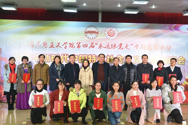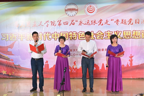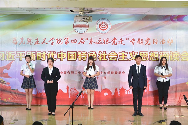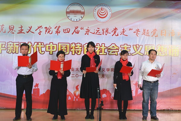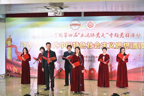 12月27日晚,350vip8888新葡的京集团第四届“永远跟党走”专题党日活动——习近平新时代中国特色社会主义思想诵读会在翡翠湖校区建艺馆负一楼报告厅举行,来自全院各师生党团支部的200余名党员和入党积极分子参加了活动。校党委宣传部、党委统战部、党委离退休工作部、校团委、计算机与信息学院负责人应邀与师生们一同观看了演出。