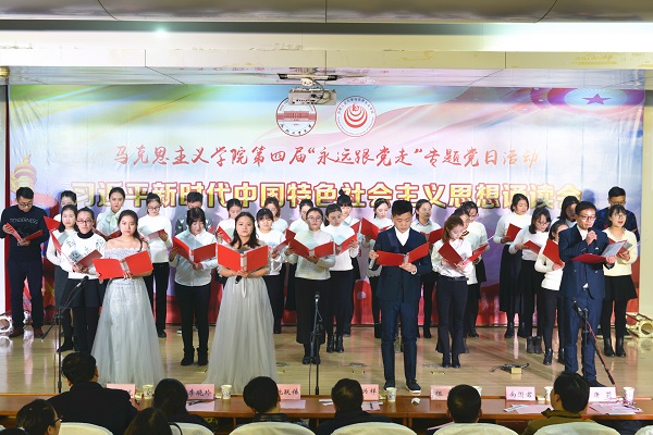 活动中,学生党支部的表现也精彩纷呈,处处洋溢着青春奋进的气息。院学生会选送的原创诗歌朗诵《我为什么要成为青年马克思主义者》,表达了同学们作为新时代的新青年,在实现中国梦的伟大征程中,以执着的信念、优良的品德、丰富的知识、过硬的本领,勇做新时代的奋进者、开拓者、奉献者,担负起历史赋予的重任的决心。在研究生2016级和2017级党支部《放歌十九大》的朗诵中,同学们展望新时代,寄予未来美好愿景。思政17-1班团支部的同学们在《五月的花海》朗诵中,带着习近平总书记对于青年寄予的殷切期望,宣誓用青春拥抱新时代,立志不负重托,为实现中华民族伟大复兴注入青春力量。此外,还有思政和法学专业本科生党支部、思政15和 16级团支部、研究生2015级马理论党支部、研究生2016级马理论党支部、研究生科学技术哲学党支部分别带来的《天下为公,道义担当》《青年礼赞》《祖国颂》《诗意中国》《党的赞歌》等作品。最后,诵读会在合唱《不忘初心》中落下帷幕。