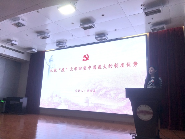 李秋晨以《从抗“疫”大考回望中国最大的制度优势》为题,分享了自己在疫情防控中参加志愿服务的经历与感受。她用一幅幅图片和一系列数字,再现了抗击疫情的“中国速度”和“中国保障”,彰显了中国特色社会主义制度优势。